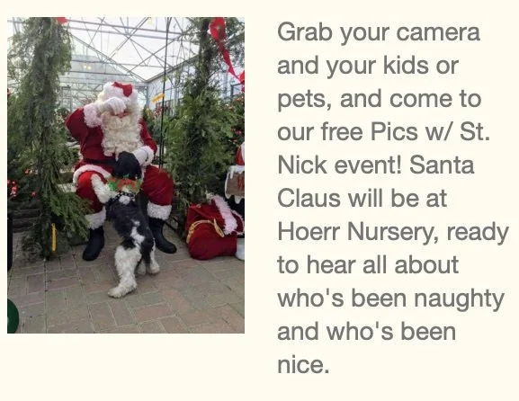 Free Pics w/ St. Nick for kids & pets Saturday, December 7, 2024 11:00 AM 2:00 PM 11:00 14:00 Hoerr Nursery 8020 North Shade Tree Drive Peoria, IL, 61615 United States (map) Google Calendar ICS